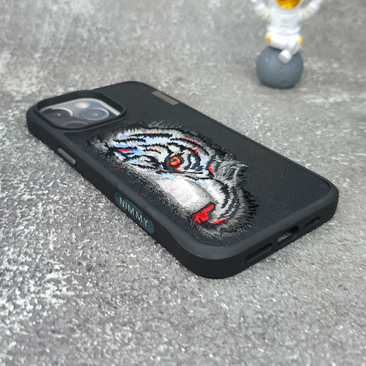 iPhone 14 Pro Max Nimmy 3D Embroided Tiger Face Leather Case - Black