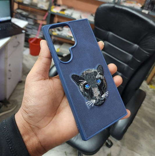 Samsung Galaxy S23 Ultra 3D Black Panther Face Embroidery PU Leather Case
