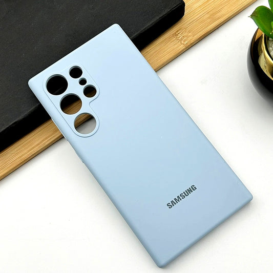 Samsung Galaxy S24 Ultra Soft Silky Liquid Silicon Case With Logo - Sky Blue / Lavender / Off White
