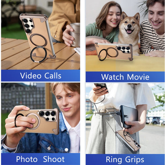 Samsung Galaxy S25 Ultra Metal Leather Case, Frameless Bumper Magsafe Kickstand with 360° Rotation Ring - Black