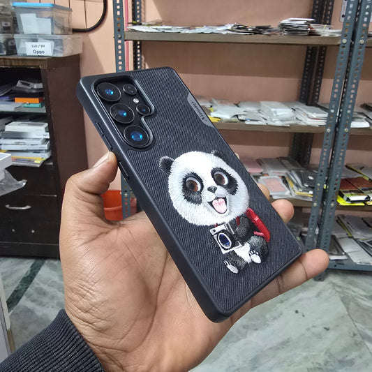 Samsung Galaxy S25 Ultra Nimmy Case, 3D Embroidery Cute Panda Leather Case with Moving Eyes - Black
