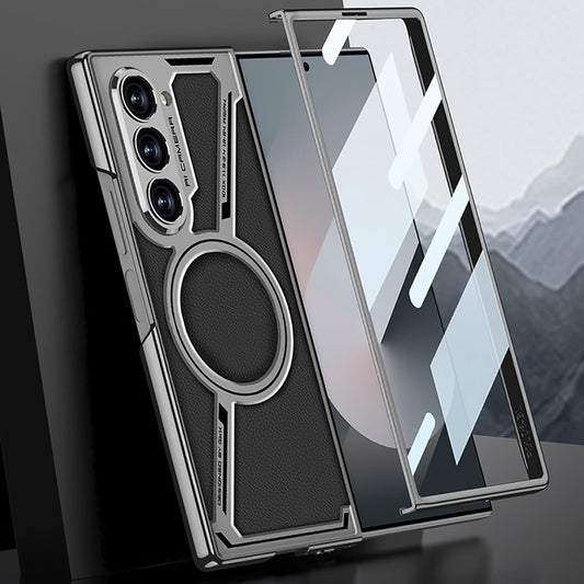 Samsung Galaxy Z Fold6 Luxury Business Leather Gold Electroplating Cover with Built-in Front Glass - Black