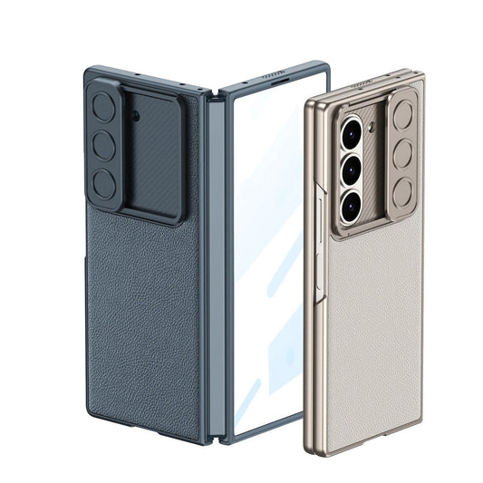 Samsung Galaxy Z Fold6 Leather Case with Slide Camera Cover Front In-Built Glass - Silver