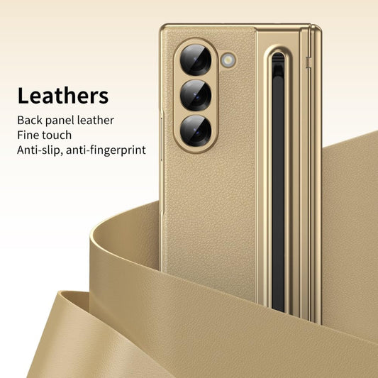 Samsung Galaxy Z Fold6 Leather Case, Electroplating S Pen Case with Kickstand & Hinge Protection - Gold