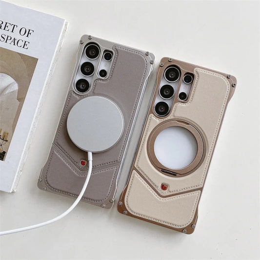 Samsung Galaxy S24 Ultra Metal Case, Frameless Leather Metal Cover Magsafe 360° Rotation Ring - Titanium